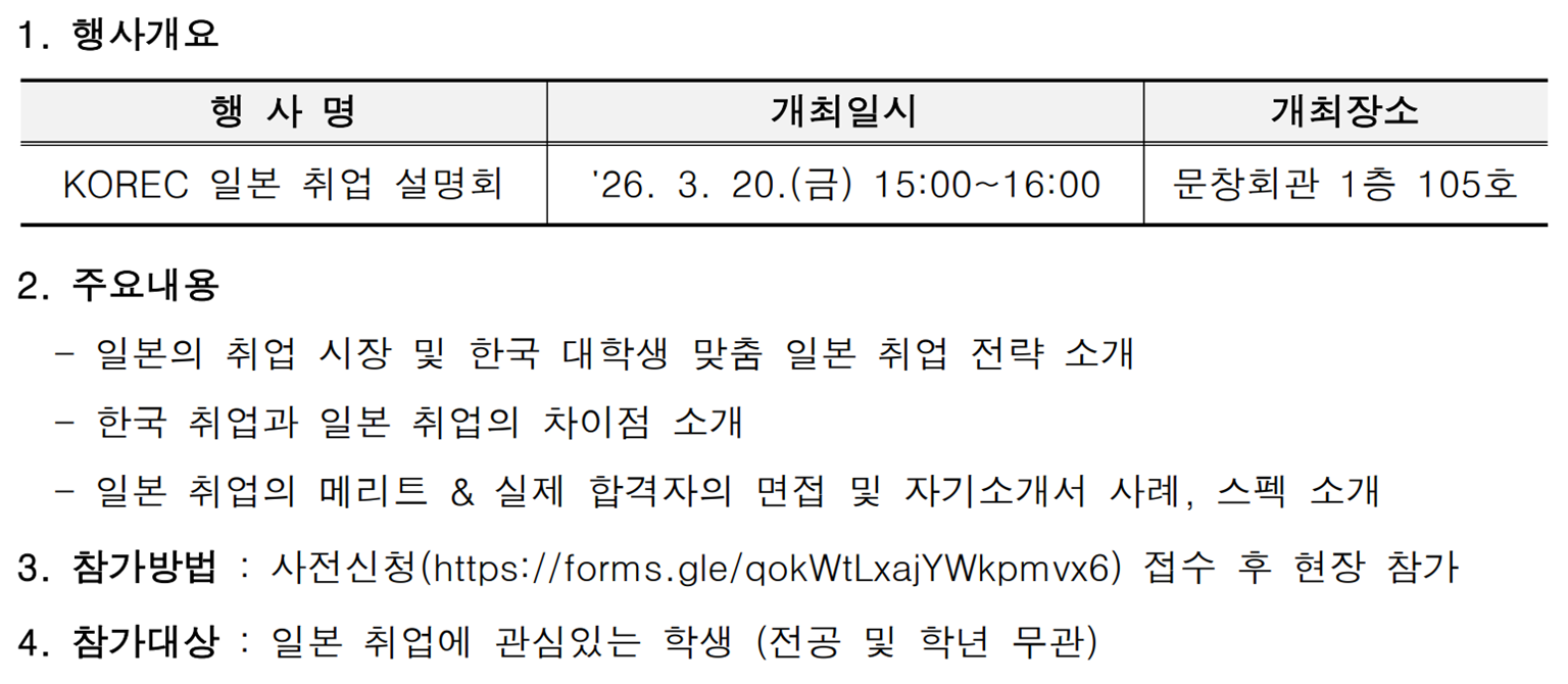 (주)비웰코리아 KOREC 일본 취업 설명회 일정을 아래와 같이 안내드리니, 관심 있는 학생들의 많은 참여 바랍니다.